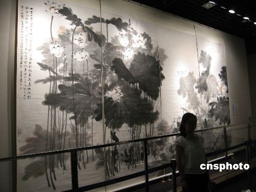 7月3日至8月3日,由遼寧省博物館、臺(tái)北歷史博物館、中華海峽兩岸文化資產(chǎn)交流促進(jìn)會(huì)共同主辦的《南張北溥——臺(tái)北歷史博物館藏張大千、溥心畬書畫作品展》,在遼寧省博物館舉辦。展品中張大千的《大墨荷通屏》畫長(zhǎng)6米、高3.58米,可稱得上是巨作,很多參觀者被其所吸引。圖為7月7日,人們紛紛在畫作前拍照留念。中新社發(fā) 沈殿成 攝
