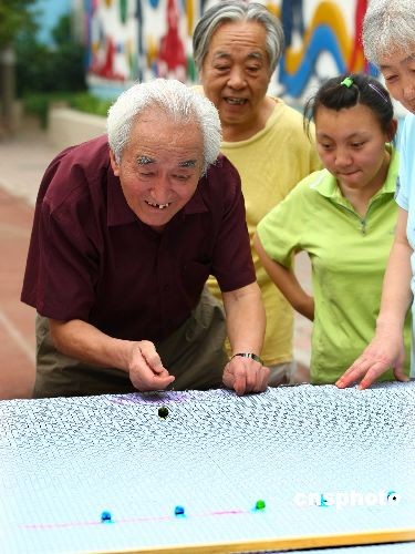 7月11日,在北京安貞社區(qū),一場名為“懷憶童年”的趣味運(yùn)動會在小區(qū)內(nèi)舉行,滾鐵環(huán)、耍拐、彈球兒、挑棍兒、抽漢奸、打包兒、拍三角等十幾個項目吸引了社區(qū)百余位老年人的熱捧,報名參賽運(yùn)動員的平均年齡達(dá)到了70歲。據(jù)社區(qū)居委會工作人員介紹,懷舊運(yùn)動會能讓老年人更好的強(qiáng)身健體,更能追憶美好童年。中新社發(fā) 富田 攝