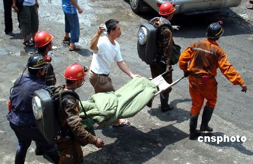 貴州晴隆新橋煤礦“6.17”透水事故在全體搶險救援人員的艱苦努力、日夜奮戰(zhàn)下,歷經(jīng)25天、604小時的搶險救援,取得突破性進展,2009年7月12日12時,在礦井上山巷與平巷交叉處成功營救出王圈杰、王礦偉、趙衛(wèi)星3名被困礦工,他們均為河南汝陽人,營救出井時,意識較清醒,三人創(chuàng)造了604小時的生命奇跡,在場的全體搶險救援人員都為他們頑強的生命所感動。目前,救援指揮部醫(yī)護人員正在對他們進行身體檢查,并采取相應的醫(yī)療措施對他們進行醫(yī)療救護,據(jù)觀察,生命體征基本平穩(wěn)。同時,搶險救援人員正在井下緊急搜救其他被困礦工。中新社發(fā) 彭年 攝