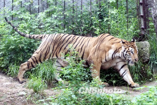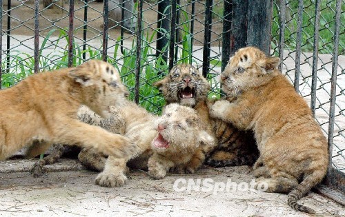 7月20日,在濟(jì)南野生動(dòng)物世界,剛出生2個(gè)月的四胞胎小老虎首次走出產(chǎn)房與游客見面。據(jù)了解,該景區(qū)飼養(yǎng)的孟加拉虎“虎妞”于5月10日產(chǎn)下四胞胎,其中兩只是金虎,一只雪虎,一只孟加拉虎,專家介紹,一胎產(chǎn)下3個(gè)品種的虎崽,在國(guó)內(nèi)還是首次出現(xiàn)。另據(jù)了解,虎有3種基因的顏色,黑色、黃色和白色,其中黑色與黃色是顯性基因,白色為隱性基因,當(dāng)黃色基因不能表達(dá)時(shí),被白色基因掩蓋,就生出白虎,黑色與黃色基因都沒有表達(dá)時(shí),白色基因就成為顯性基因,就生出雪虎,當(dāng)白色與黑色基因變成隱性基因時(shí),就會(huì)生出金黃色的虎,也稱為“金虎”。中新社發(fā) 龔輝 攝