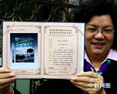 在2009年12月底,這幅畫送權(quán)威機(jī)構(gòu)北京中博文物檢測鑒定中心鑒定,經(jīng)資深文物鑒定專家陳行一先生鑒定,確認(rèn)為徐悲鴻大師的真跡。陳行一在鑒定意見中還寫道:“劉夫人亦屬豬,是圖繪一家子豬,肥肥胖胖,相依相偎,富貴滿堂。形體結(jié)構(gòu)、透視比例準(zhǔn)確,水墨淡色十分到位,形態(tài)逼真。背景敷以湖蕩水草,筆觸簡練,不愧為大師之作。畫家作豬十分罕見,彌足珍貴。”