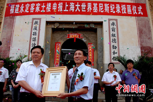 6月12日上午,上海大世界基尼斯總部在世界遺產(chǎn)永定“承啟樓”舉行授匾儀式。上海大世界基尼斯總部將“大世界基尼斯之最·擁有‘福建土樓’最多的縣——福建省永定縣”的匾牌授予永定縣,標志著永定客家土樓成為基尼斯記錄中的重要一員。 匾牌上銹刻著:該縣現(xiàn)存“福建土樓”23000座,遍布各個鄉(xiāng)鎮(zhèn)、村落,其中圈數(shù)最多、建筑規(guī)模最大的為“承啟樓”;最高的為“永隆昌樓”;最古老的為“龍安寨”(始建于唐朝)。 劉永良 攝