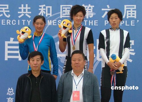 十月二十三日,第六屆城市運動會自行車場地賽在河南洛陽新區(qū)體育中心開賽,女子三公里個人追逐賽冠軍被煙臺市隊的姜帆(中)奪得,北京順義隊的王翠、煙臺隊的姜吻吻分獲二、三名。中新社發(fā) 史寶銀 攝