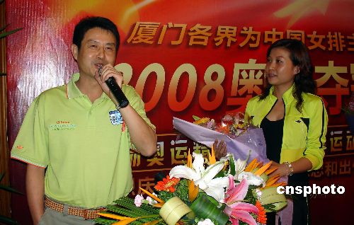 十月二十八日晚,在廈門各界“為中國女排主教練陳忠和二○○八奧運奪冠加油”酒會上,陳忠和表示,明年奧運會中國女排奪冠征途面臨六、七支勁敵,中國女排將迎難而上,奮力奪冠。中新社發(fā) 楊伏山 攝