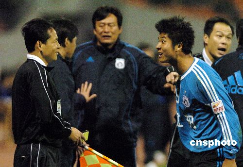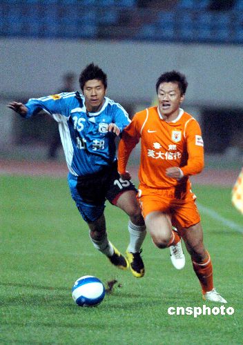 11月1日,2007中國足球超級聯(lián)賽第27輪在山東濟(jì)南的一場比賽中,主場作戰(zhàn)的山東魯能泰山隊1比1戰(zhàn)平大連實(shí)德足球隊。中新社發(fā) 張侃 攝