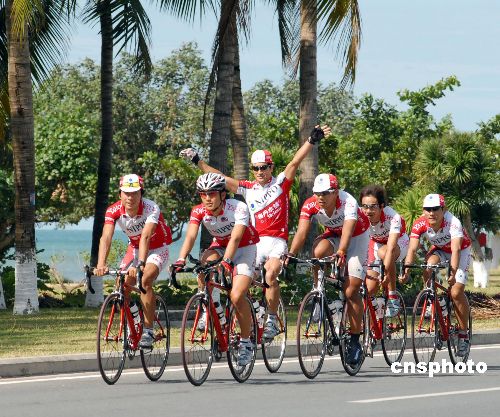 來自二十四個國家和地區(qū)的十八支參賽隊伍、一百零六名自行車手已于十一月二日全部抵達海南三亞。上午九時許,各隊選手開始熱身,為明天開始的海馬汽車二00七環(huán)海南島國際公路自行車賽做準備。中新社發(fā) 彭小云 攝