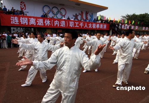 11月2日,湖南漣鋼離退休老職工參加千人太極拳表演。據(jù)悉,該集團(tuán)為宣傳奧運(yùn)會(huì)精神,開展“與奧運(yùn)同行,與健康同行”千人太極拳表演活動(dòng)。中新社發(fā) 郭國(guó)權(quán) 攝