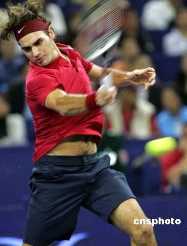 11月12日,“智利火炮”岡薩雷斯在2007上海網(wǎng)球大師杯賽紅組單打比賽中,實現(xiàn)驚人逆轉(zhuǎn)以2比1戰(zhàn)勝瑞士球王費(fèi)德勒,三盤比分是3-6、7-6、7-5。中新社發(fā) 湯彥俊 攝