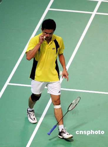 十一月三十日晚,世界排名第一的中國選手林丹在二零零七中國香港羽毛球超級賽上以二比零戰(zhàn)勝印尼名將陶菲克,晉級四強。圖為陶菲克在比賽中摔拍。中新社發(fā) 武仲林 攝