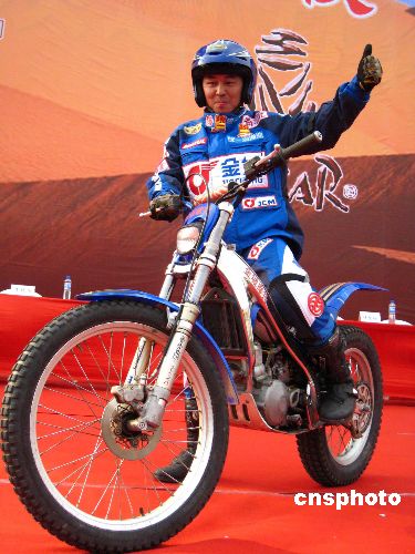 12月8日下午,中國首位摩托車手曹魯征戰(zhàn)2008年達(dá)喀爾拉力賽出征發(fā)車儀式在南京白馬公園舉行。今年30歲的曹魯曾先后獲得全國摩托車越野技巧賽冠軍、第二屆中國沙漠環(huán)塔拉力賽摩托車組總冠軍等榮譽。這次曹魯成為第一位摩托車手代表中國參加2008年1月5日發(fā)車的第30屆巴黎--達(dá)喀爾拉力賽,實現(xiàn)了他個人和中國摩托車界的夢想。中新社發(fā) 谷昌旺 攝