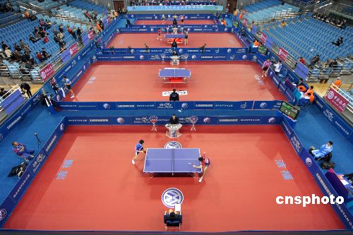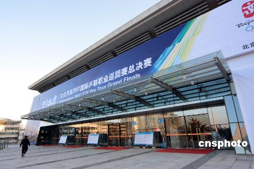 12月13日,新近落成的北京大學(xué)奧運(yùn)乒乓球館迎來(lái)“好運(yùn)北京”2007年ITTF職業(yè)巡回賽總決賽。奧運(yùn)乒乓球館可提供固定與活動(dòng)座位共7557座,其中位于首層的比賽場(chǎng)地長(zhǎng)47米,寬39.5米,最多可布置8張乒乓球臺(tái)同時(shí)進(jìn)行比賽。放入活動(dòng)座椅后,賽場(chǎng)變?yōu)殚L(zhǎng)27米,寬20米,可放置2張乒乓球臺(tái)進(jìn)行比賽。中新社發(fā) 吳芒子 攝