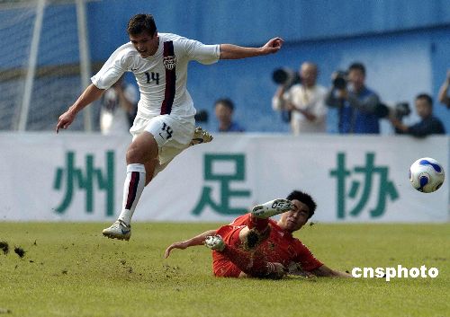 2007年12月16日下午,中國(guó)國(guó)奧隊(duì)與美國(guó)國(guó)奧隊(duì)的第二場(chǎng)友誼賽在廣州越秀山體育場(chǎng)鳴哨。在上半場(chǎng)比賽中,大幅調(diào)整陣容的中國(guó)國(guó)奧隊(duì)完全被對(duì)手壓制,美國(guó)隊(duì)由羅杰斯、蘭尼和達(dá)維斯各入一球,早早以3比0領(lǐng)先。國(guó)奧隊(duì)主帥杜伊在下半場(chǎng)頻繁換將,國(guó)奧小將們展開(kāi)反撲,朱挺、杜震宇相繼送出精彩入球,最終比分為3比3。補(bǔ)時(shí)階段王曉龍不理智的犯規(guī)引發(fā)雙方?jīng)_突,其與克里斯坦雙雙被罰下。中新社發(fā) 吳峻 攝