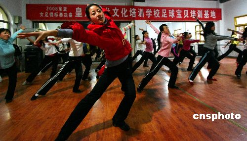 1月15日,東亞女足的“足球?qū)氊悺眰冊谟?xùn)練。2008年東亞女足錦標(biāo)賽將于2月17日-24日在重慶市永川區(qū)體育中心舉行,永川區(qū)從該區(qū)大中院校選出42名“足球?qū)氊悺,進(jìn)行為期一個(gè)月的藝術(shù)體操、姿態(tài)等基本功訓(xùn)練,屆時(shí)將以嶄新身姿展現(xiàn)在人們面前。中新社發(fā) 陳仕川 攝