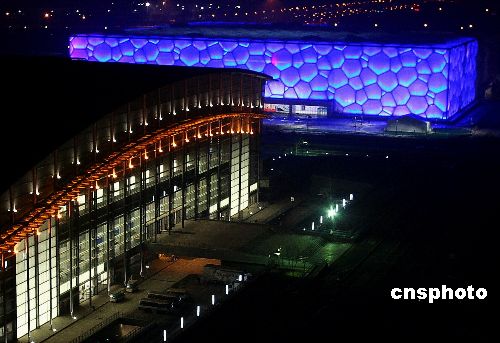 1月21日,北京奧林匹克公園內(nèi)的北京奧運會游泳館-水立方進行夜景燈光調(diào)試,迎接1月31日在這里舉行的“好運北京”中國游泳公開賽。中新社發(fā) 富田 攝