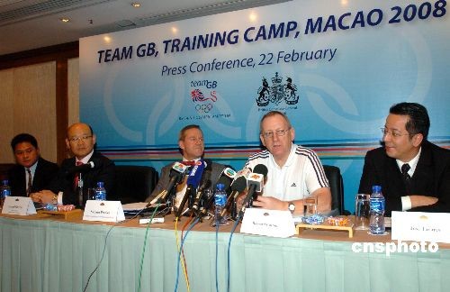 二月二十二日,英國奧運(yùn)協(xié)會(huì)在澳門文華酒店舉行的記者會(huì)上宣布:英國奧運(yùn)協(xié)會(huì)將在澳門設(shè)立訓(xùn)練營,二百五十多名參加二00八年北京奧運(yùn)會(huì)的英國運(yùn)動(dòng)員、教練及工作人員在奧運(yùn)會(huì)舉行前兩至三周內(nèi),來澳門進(jìn)行集訓(xùn)。英國奧運(yùn)協(xié)會(huì)向澳門特區(qū)政府及體育機(jī)構(gòu)致謝,感激他們在籌備訓(xùn)練營中給予的支持。中新社發(fā) 史利 攝