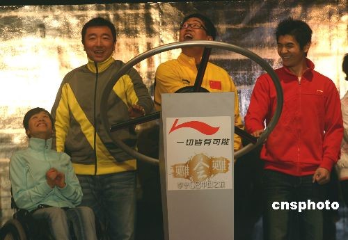 3月22日,“李寧零八中國之旅”活動在北京朝陽公園啟動,該活動將通過“大篷車”巡游的形式,歷時9個月,行程4萬公里,途經(jīng)全國近百座中型城市宣傳奧運精神、大屏幕直播北京奧運會比賽,并開展三加一籃球挑戰(zhàn)賽等一系列全民健身活動。 圖為前中國體操隊選手桑蘭(左一)、奧運冠軍楊凌(左二)、邢傲偉(左四)等在啟動儀式上。中新社發(fā) 沈晨 攝