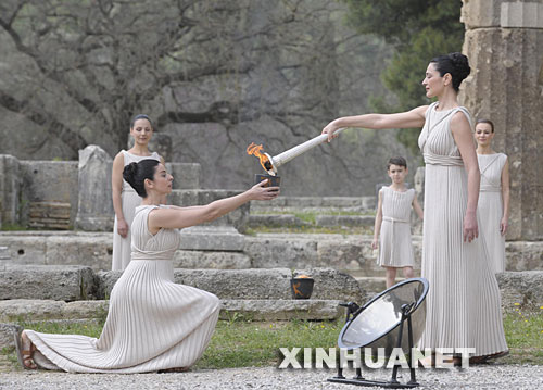 3月24日,北京奧運會圣火取火儀式在希臘奧林匹亞舉行。圖為扮演最高女祭司的瑪利亞·娜芙普利都(前右)點燃火種罐。 新華社記者戚恒攝