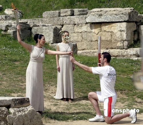 希臘當(dāng)?shù)貢r(shí)間3月24日,北京二00八年奧運(yùn)會(huì)圣火采集儀式在古奧林匹亞競(jìng)技場(chǎng)舉行,最高女祭司將橄欖枝傳遞給第一火炬手希臘運(yùn)動(dòng)員亞歷山大,并用古希臘語(yǔ)對(duì)他說(shuō):“將圣火傳遞給世界,告訴人們奧運(yùn)會(huì)就要開始了。中新社發(fā) 王歡 攝