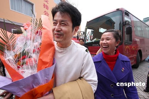 4月3日中午13時許,由陳忠和帶領(lǐng)的中國女排乘大巴從廣州回到女排“娘家”——湖南郴州。展開為期28天的封閉訓練。 中新社發(fā) 陳建平 攝