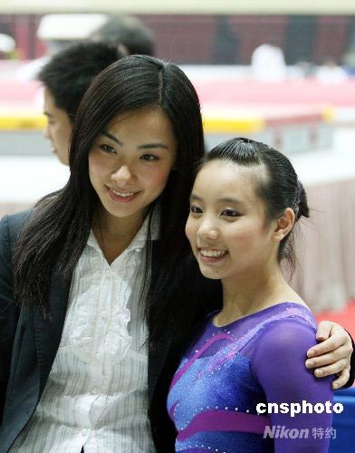 5月7日,奧運(yùn)冠軍劉璇與小運(yùn)動(dòng)員親切交流并合影留念。當(dāng)日,2008全國體操錦標(biāo)賽暨奧運(yùn)選拔賽在天津舉行,以裁判身份亮相賽場的劉璇備受關(guān)注。中新社發(fā) 郭曉帆 攝
