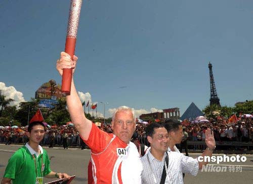 5月8日,奧運(yùn)圣火在深圳進(jìn)行傳遞。在深圳世界之窗門前芬蘭籍火炬手芬蘭前奧委會主任塔帕尼·愛爾卡同深圳市民同樂祥云火炬。中新社發(fā) 廖攀 攝
