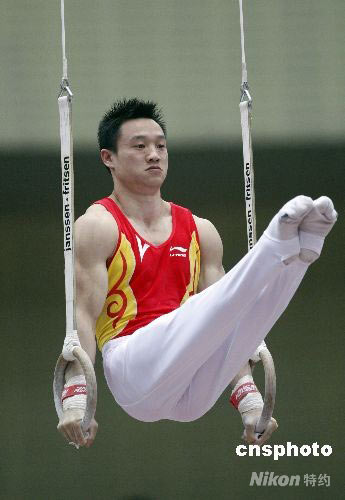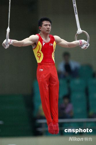 5月10日,2008全國(guó)體操錦標(biāo)賽暨奧運(yùn)選拔賽在天津體育中心進(jìn)入最后一個(gè)比賽日的爭(zhēng)奪,楊威和陳一冰并列吊環(huán)冠軍,成績(jī)同為17.10分。中新社發(fā) 杜洋 攝