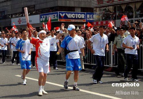 5月11日上午,福建年齡最大的火炬手,九十四歲香港籍的歐椿堃老先生正在傳遞北京奧運火炬。當(dāng)日,北京奧運火炬福建站傳遞在福州來開帷幕。 中新社發(fā) 王東明 攝