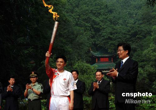 圖:熊倪舉起奧運火炬長沙傳遞首棒