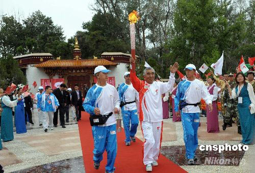 北京奧運會火炬二十一日九時十分許在西藏自治區(qū)首府拉薩開始傳遞,第一次從北坡登上珠峰的藏族登山老英雄貢布擔任第一棒。此次拉薩傳遞共一百五十六名火炬手,其中包括七十八名以藏族為主題的少數(shù)民族和一名外籍人士。傳遞起點設(shè)在有“寶貝園林”之稱的羅布林卡廣場。 中新社發(fā) 廖攀 攝