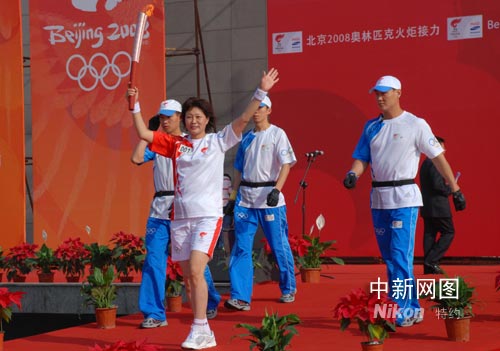 6月25日上午,奧運(yùn)火炬在山西運(yùn)城傳遞,8時(shí)15分山西第一棒火炬手,1984年洛杉磯奧運(yùn)會女子手球比賽團(tuán)體銅牌得主張衛(wèi)紅接過點(diǎn)燃的火炬開始傳遞。張雷杰 攝
