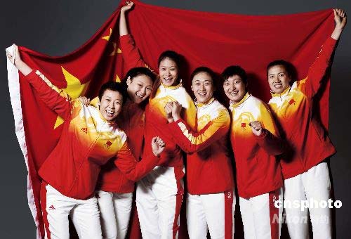 身著北京奧運(yùn)會領(lǐng)獎服的中國女排姑娘與國旗激情合影。北京奧運(yùn)會中國代表團(tuán)領(lǐng)獎服日前在北京披露,衛(wèi)冕冠軍中國女排的姑娘們試穿領(lǐng)獎服,在五星紅旗下愈加風(fēng)采。中新社發(fā) 沈晨 攝