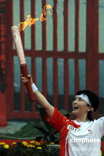 7月28日,中國(guó)中央電視臺(tái)新聞播音員李瑞英,作為河南安陽(yáng)的第一棒火炬手,高舉北京奧運(yùn)火炬開(kāi)始安陽(yáng)火炬?zhèn)鬟f。 中新社發(fā) 慎重 攝