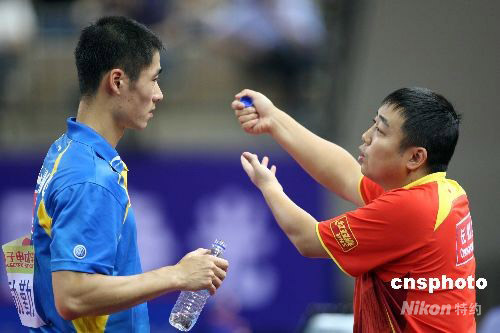 7月29日,中國乒乓球隊(duì)備戰(zhàn)奧運(yùn)熱身賽在無錫繼續(xù)進(jìn)行,男隊(duì)針對非奧運(yùn)選手制定獎(jiǎng)勵(lì)機(jī)制,在以王皓、馬琳、王勵(lì)勤3人為擂主的擂臺賽上,每名非奧運(yùn)選手獲得一場勝利,就將獲得2009年一項(xiàng)國際公開賽的參賽權(quán);獲得兩場勝利就能獲得2009年世乒賽單項(xiàng)比賽的參賽資格;獲得三場勝利則可以直接獲得2009年世乒賽男單比賽的參賽資格。擂主王勵(lì)勤在比賽中苦戰(zhàn)7局最終4比3完成大逆轉(zhuǎn)戰(zhàn)勝小將徐輝,主教練劉國梁賽中緊急指導(dǎo)。中新社發(fā) 盛佳鵬 攝