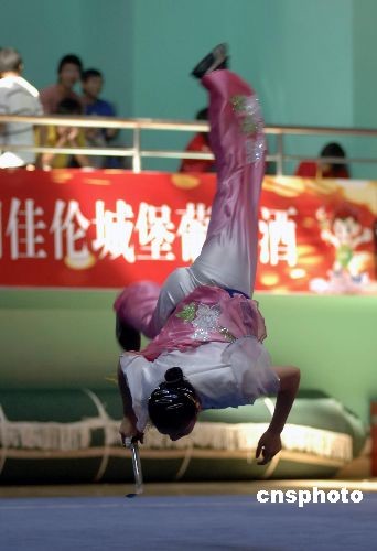 10月28日,武術(shù)女子選手進(jìn)行劍術(shù)比賽。第六屆全國農(nóng)民運動會武術(shù)比賽在福建省泉州市體育中心吳家熊國術(shù)館進(jìn)行,武林高手匯集于此,展示高超的國術(shù)技藝。中新社發(fā) 王東明 攝