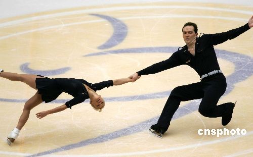 11月7日,2008/09賽季花樣滑冰大獎賽中國站比賽,在北京首都體育館結(jié)束了第二天的爭奪。在壓軸進行的雙人自由滑比賽中,中國組合張丹/張昊順利摘得金牌,烏克蘭搭檔沃洛佐扎/莫洛佐夫獲得亞軍,中國另一對選手龐清/佟健排名第三。圖為烏克蘭選手沃洛佐扎/莫洛佐夫在比賽中做托舉動作。中新社發(fā) 富田 攝