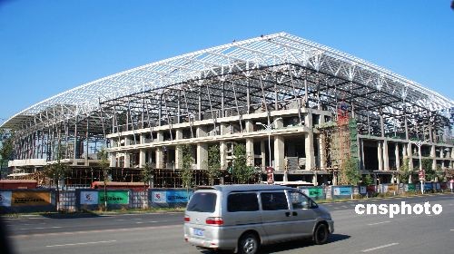 2008年11月8日,沈陽奧體中心綜合體育館已現(xiàn)形。該館可容納8000名觀眾,可滿足羽毛球、乒乓球、體操、拳擊等賽事對場館的要求,還可舉辦大型音樂會、演唱會。沈陽奧體中心建筑群“一場三館”,由奧體中心一座體育場、一座綜合體育館、一座游泳館和一座網(wǎng)球館組成。中新社發(fā) 劉寶成 攝
