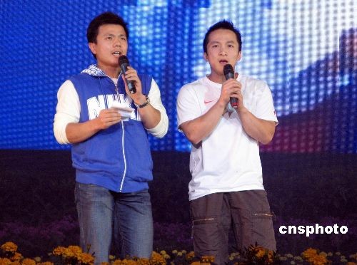11月17日晚,在“客家祖地”福建龍巖舉行的第五屆中國(guó)龍巖投資項(xiàng)目洽談會(huì)文藝晚會(huì)上,福建龍巖籍奧運(yùn)冠軍張湘祥、石智勇同臺(tái)為海內(nèi)外鄉(xiāng)親深情演繹一曲《朋友》。中新社發(fā) 張彩林 攝