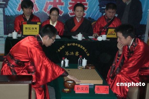 11月19日,“永城杯”第二十一屆中國(guó)圍棋名人戰(zhàn)五番棋決賽第四局較量在河南省永城市進(jìn)行,古力九段在“福地”又下一城,執(zhí)黑289手中盤擊敗樸文堯五段,將總比分扳成2比2平,衛(wèi)冕冠軍的希望大增。圖為樸文堯(左)與古力在對(duì)局中。中新社發(fā) 沈晨 攝
