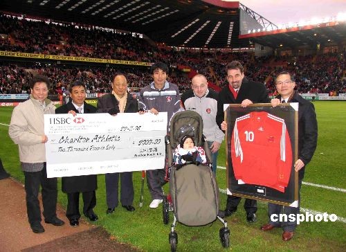 當地時間11月22日下午,倫敦,英冠聯賽第18輪,查爾頓主場迎戰(zhàn)謝菲爾德聯隊。中場休息之際,查爾頓隊中國球員鄭智(左四)現場貢獻出一件親筆簽名的在中國國家隊所披10號戰(zhàn)袍,拍賣所得款項為一位殘疾小球迷購買高級輪椅。英國泗和行集團老板謝貴全(左三)當場慷慨解囊兩千英鎊,拍得該件球衣。中新社發(fā) 楊冉 攝