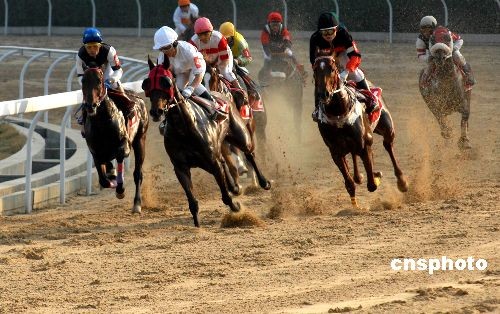 11月26日,2008全國速度賽馬錦標(biāo)賽在湖北武漢市“東方馬城”揚(yáng)鞭開賽。當(dāng)日下午,分別進(jìn)行了1000米純血馬2個(gè)組和1800米無限定馬2個(gè)組的預(yù)賽,總決賽將于本月30日進(jìn)行。據(jù)了解,本次賽事吸引了包括解放軍代表隊(duì)在內(nèi)的來自全國20支代表隊(duì)80多名騎師和120余匹賽馬參加。中新社發(fā) 楚天行 攝