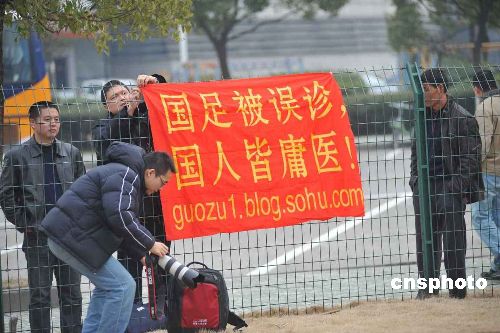 1月21日,國足將在杭州黃龍?bào)w育中心應(yīng)戰(zhàn)亞洲杯預(yù)選賽的第二個(gè)對手越南隊(duì)。今天,國足來到體育場開始簡單熱身,F(xiàn)場球迷拉起橫幅“國足被誤診 國人皆庸醫(yī)”,國足隊(duì)員先后步入球場,執(zhí)著的球迷依然撐著橫幅,站在場外。 中新社發(fā) 陳穎 攝