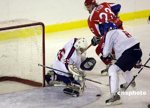 2月25日晚最后一場男子冰球小組賽由俄羅斯對陣斯洛伐克,整場比賽火爆激烈,最終俄羅斯隊9:3取勝,保持小組不敗進入半決賽。中新社發(fā) 王韶驊 攝