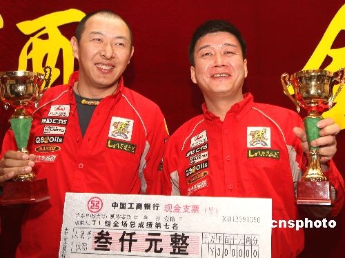 3月10日,經(jīng)過三天的激烈角逐,“金馬杯”第六屆漠河冰雪汽車越野賽暨全國汽車越野系列賽,在黑龍江省漠河縣境內(nèi)中俄界江黑龍江攝氏零下20多度的自然冰雪江面上結(jié)束,長豐汽車華南虎車隊(duì)劉斌(右)在三天的比賽中兩次奪得“飛車王”獎(jiǎng),最終獲得全場(chǎng)“飛車王”獎(jiǎng)。中新社發(fā) 趙振清 攝