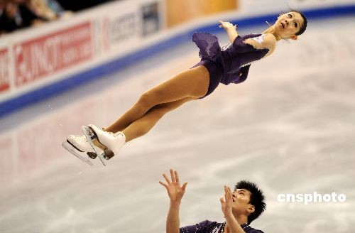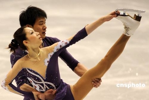 當(dāng)?shù)貢r(shí)間三月二十五日晚,在二00九年花樣滑冰世界錦標(biāo)賽雙人滑決賽中,中國選手張丹/張昊獲得亞軍。中新社發(fā) 張煒 攝