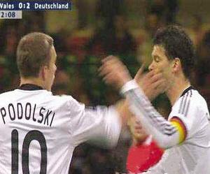 2比0,德國(guó)隊(duì)擊敗威爾士,世界杯出線形勢(shì)大好。不過勝利也不能讓所有人都開心,為德國(guó)隊(duì)首開紀(jì)錄的隊(duì)長(zhǎng)巴拉克就很郁悶,比賽中他被隊(duì)友波多爾斯基扇了一記耳光!八(dāng)時(shí)不是很認(rèn)同我的看法,但在球場(chǎng)上就該聽從我的意見,而不是用手來攻擊我!辟惡蟀屠藨嵟卣f。
