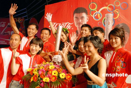 10月24日晚,海南“2008北京奧運會火炬手頒獎禮”在?谂e行。李平、譚麗林、凌萍、韓燕等10人當選為可口可樂2008奧運火炬手。據(jù)悉,經(jīng)北京奧組委審核后,這10名火炬手將正式成為北京奧運會火炬手。超女冠軍李宇春現(xiàn)身現(xiàn)場演唱助興。據(jù)悉,海南是2008北京奧運火炬?zhèn)鬟f首傳省。中新社發(fā) 善平 攝