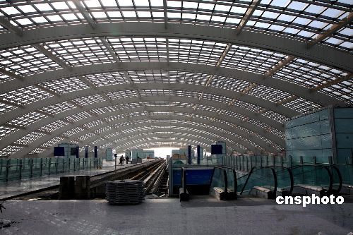 2007年11月6日,北京首都機場輕軌“3號航站樓站”接近尾聲,該車站位于首都機場3號航站樓前的交通中心內(nèi),旅客可通過扶梯直達3號航站樓。機場線全長28.1公里,自西向東共設(shè)置了4座車站,起點站——“東直門站”與地鐵2號線和13號線互為換乘站,另外還包括三元橋站(與10號線互為換乘站)和“2號航站樓站”(位于2號航站樓與停車樓之間的綠地及現(xiàn)狀道路之下,旅客可經(jīng)通道直達2號航站樓)。該工程預(yù)計2008年4月建成,7月1日開始載客試運營。屆時,機場輕軌最高運營速度100公里/小時,東直門至首都機場運行時間為16分鐘。中新社發(fā) 洪濤 攝