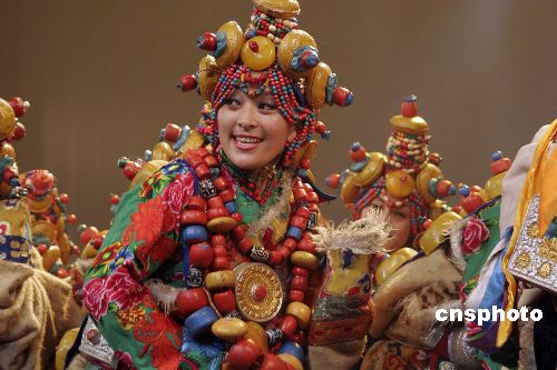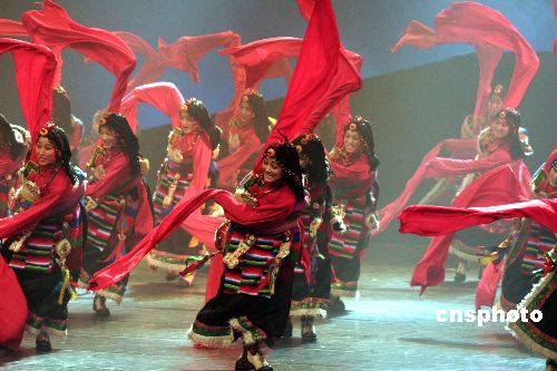 2008年1月21日,著名舞蹈家楊麗萍攜《藏謎》在海口人民大會堂上演!恫刂i》以藏族老阿媽虔誠的朝拜路途中所見為主線,表現(xiàn)了藏區(qū)牧民生活、民間習俗、宗教儀式場景。主創(chuàng)人員用了1年多的時間,行走在藏、青、川、云等各省區(qū)的20多個藏區(qū),大量收集了音樂、舞蹈、器樂、服裝等作為原始創(chuàng)作素材。劇中8成以上的演員都是藏區(qū)的牧民,完全是原生態(tài)的演出。中新社發(fā) 尹恩彪 攝