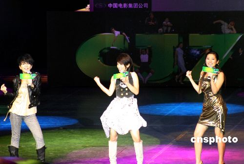圖為S.H.E在首映禮上首唱《長江7號》普通話版主題曲。