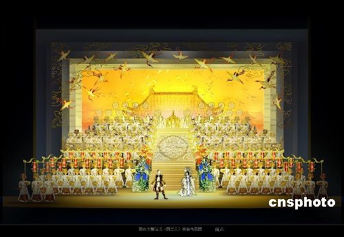 二月二十一日,中國(guó)國(guó)家大劇院版歌劇《圖蘭朵》劇組在北京公布了舞美造型圖片。圖為該劇尾聲的輝煌富麗的效果圖,視覺(jué)總監(jiān)高廣健表示,中華文化寫實(shí)細(xì)節(jié)與西方象征主義意向空間的有機(jī)結(jié)合是大劇院版《圖蘭朵》舞美設(shè)計(jì)的基本理念;尾聲的效果圖借鑒了著名的宋徽宗《瑞鶴圖》。中新社發(fā) 應(yīng)妮 攝